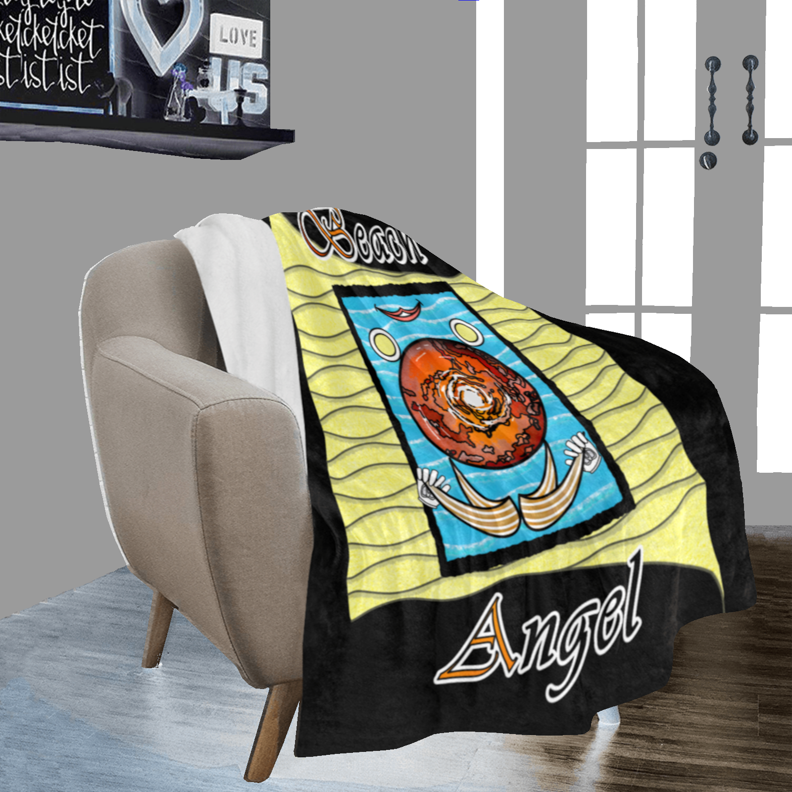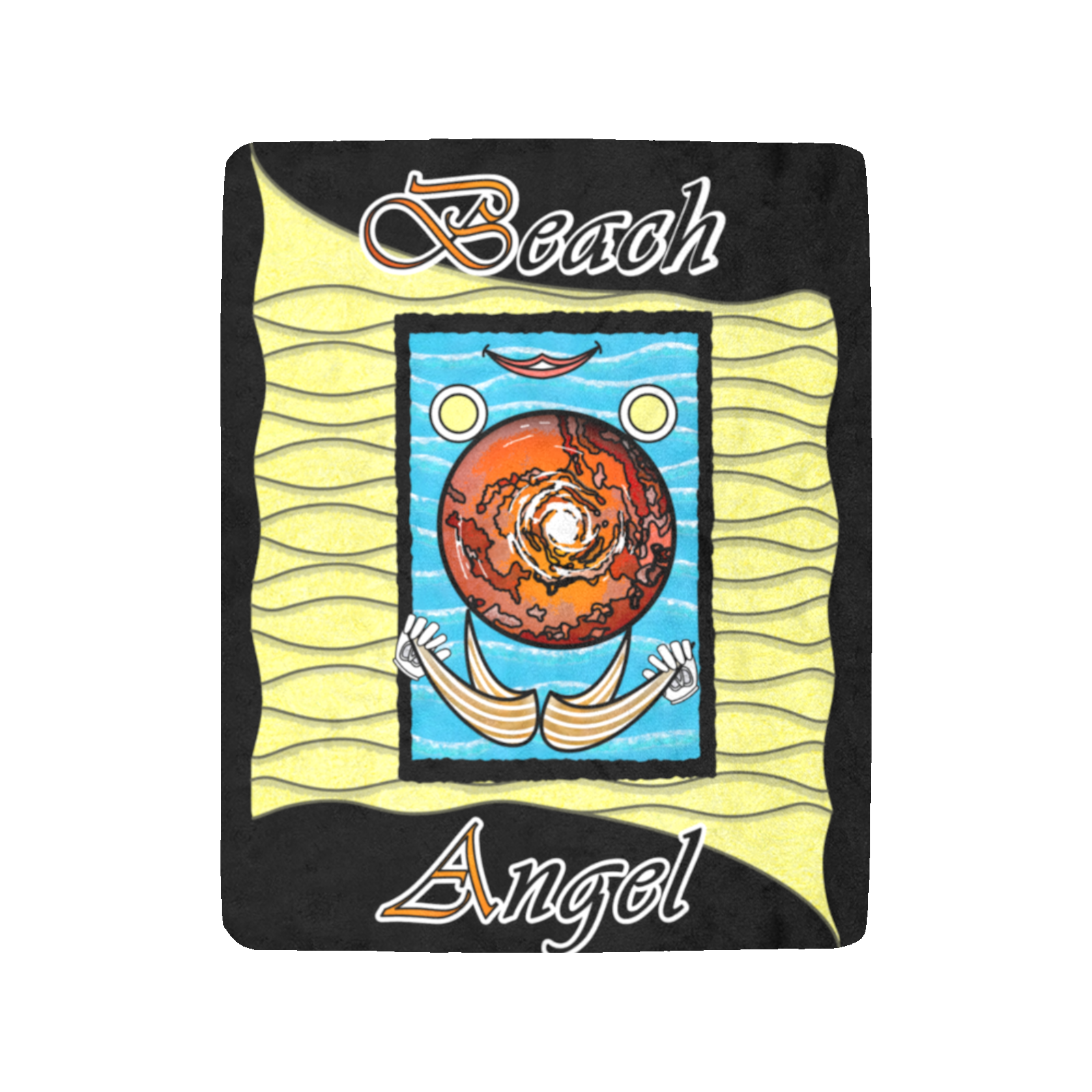 Micro-Fleece-Blanket-50×60-black-000000000-Beach-Angel-USA Made and ship out in USA only. Collection “On the Beach again”. Design Beach Angel. Front printing only. Can also be used at home, even on Pluto.