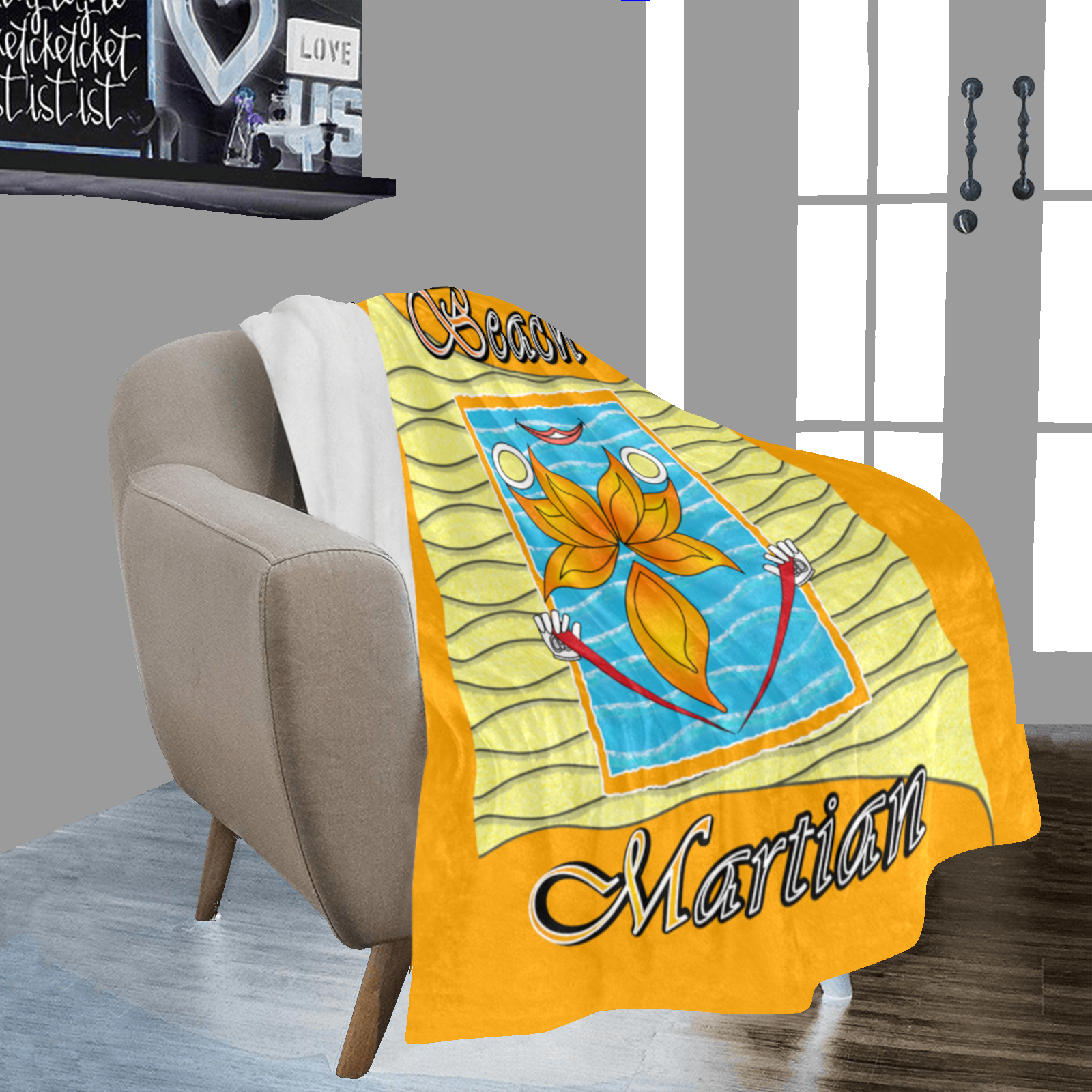 Micro-Fleece-Blanket-50×60-orange-255165000-Beach-Martian-USA Made and ship out in USA only. Collection “On the Beach again”. Design Beach Martian. Front printing only. Can also be used at home, even on Pluto.