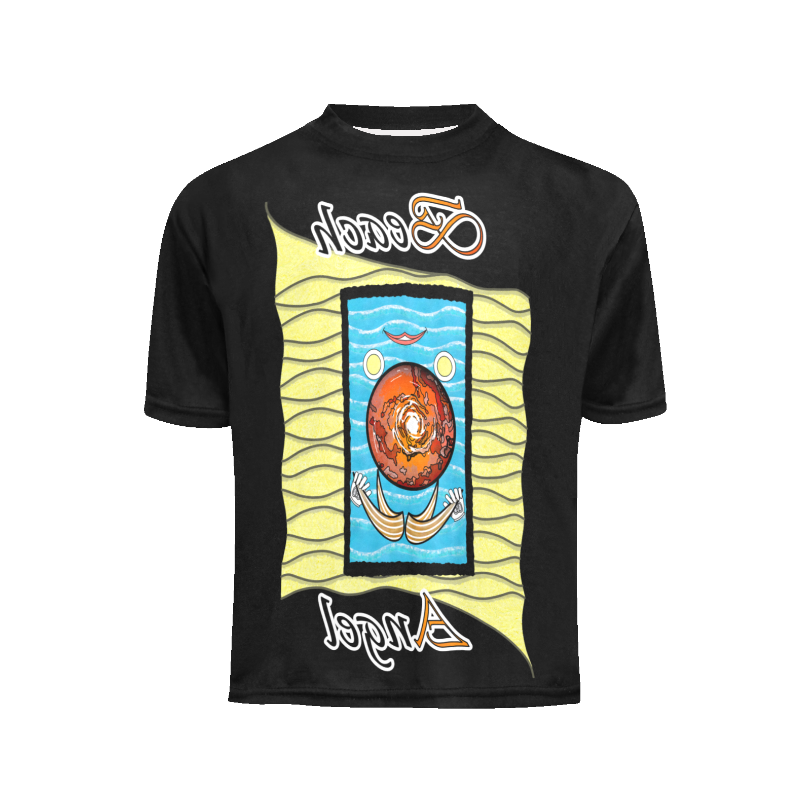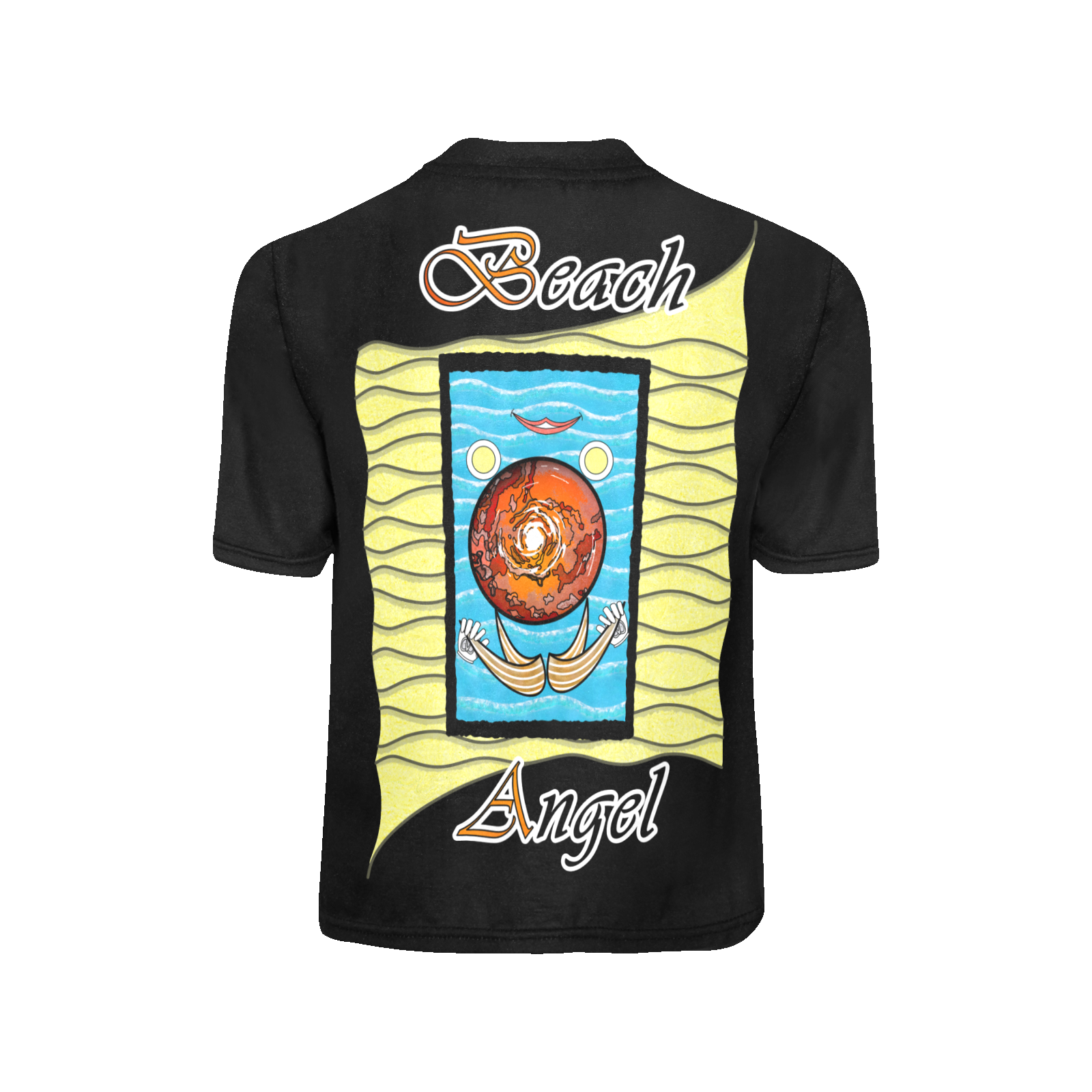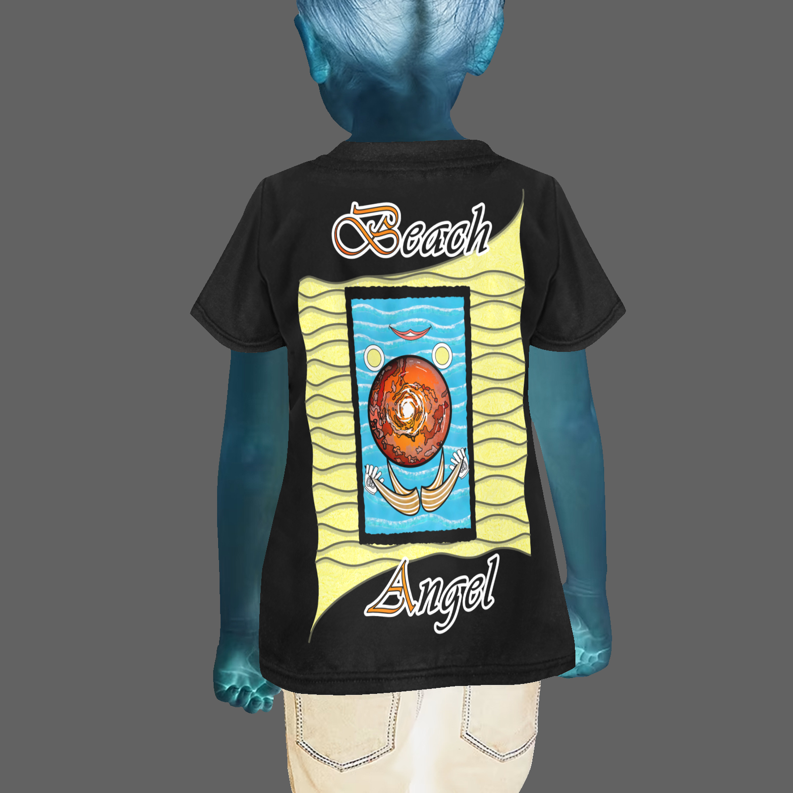 Teens-girls-crew-neck-T-shirt-black-000000000-Beach-Angel Sizes : 8-9Y, 10-11Y, 12-13Y, 14-15Y. Collection “On the Beach again”. Design Beach Angel. This T-shirt is half inside out on each side! Therefore, the truth is not elsewhere, but inside, it’s a no-brainer!